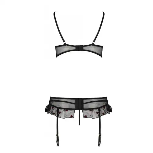 Бюстгальтер имеет чашечки на косточках с регулируемыми бретельками для индивидуальной посадки. Пояс для чулок также имеет регулируемые лямки, что позволяет подобрать идеальную длину чулок. А стринги завершают образ своим сексуальным кроем и удобным дизайном.