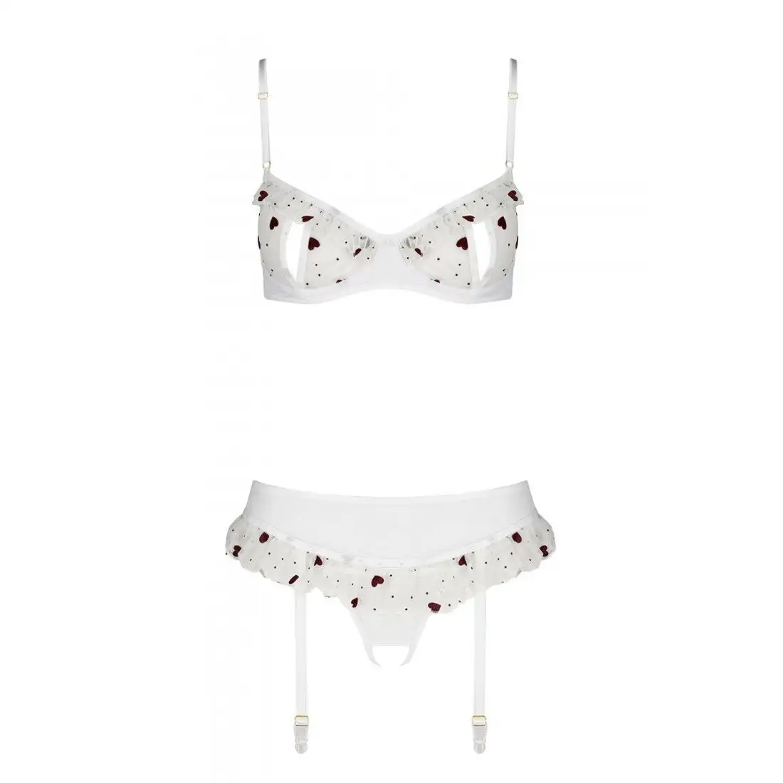 Бюстгальтер имеет чашки на косточках с тонкой отделкой из кружева и регулируемые бретели для индивидуальной посадки. Пояс для чулок также может похвастаться замысловатыми кружевными акцентами и регулируемыми ремнями, обеспечивающими идеальную посадку. Соответствующие стринги завершают образ своим сексуальным дизайном.