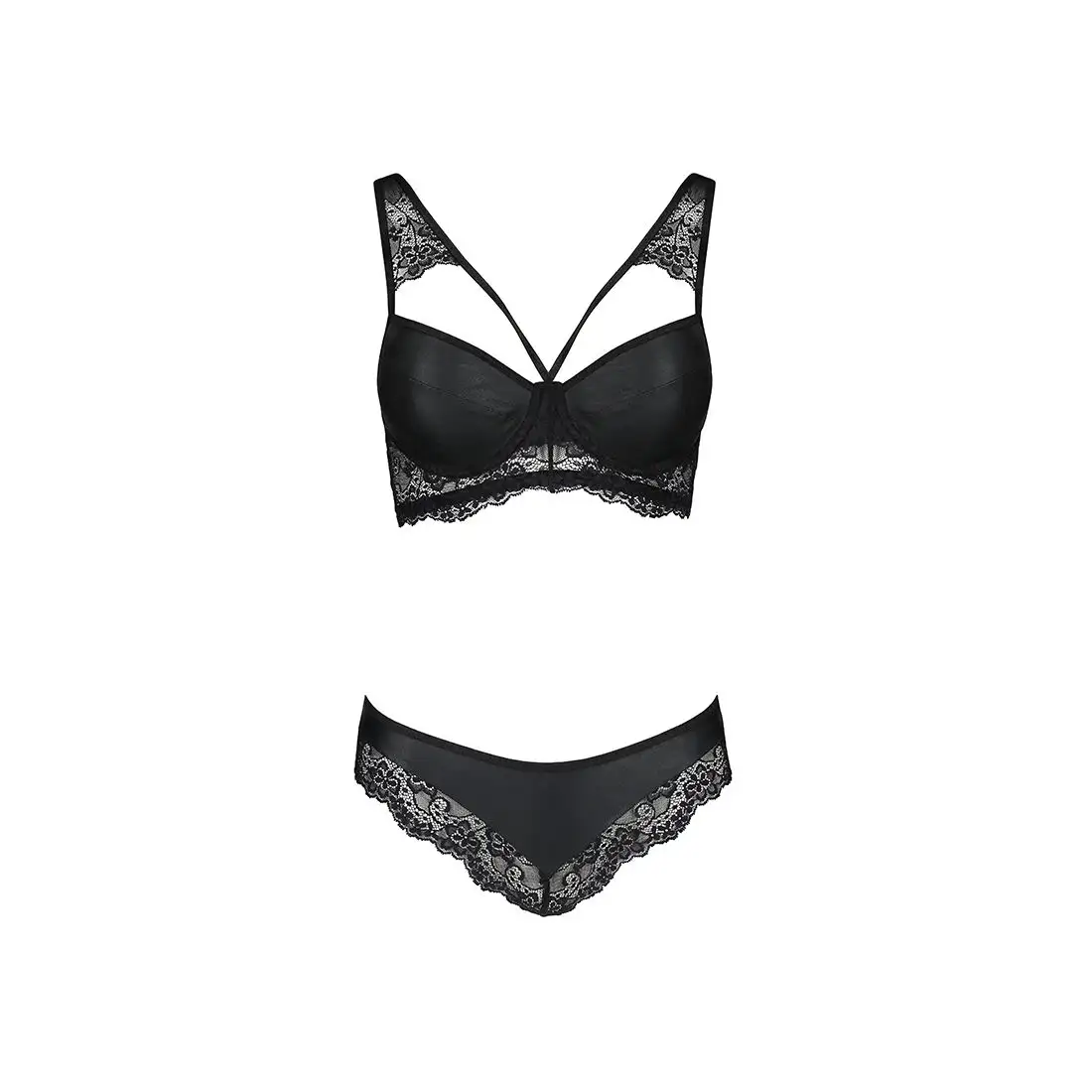 Бюстгальтер имеет чашки на косточках для поддержки, регулируемые бретели для удобной посадки и застежку на крючок сзади. Кружевная отделка придает дерзкому кожаному материалу нотку женственности. Соответствующие трусики с заниженной талией удобно сидят на бедрах, а кружевные вставки придают образу соблазнительность.
