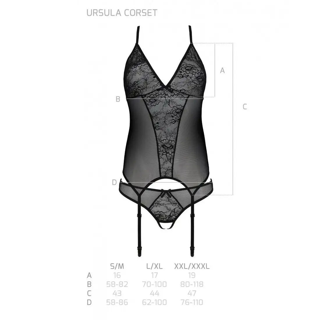 Корсет с пажами, трусики с ажурным декором и открытым шагом Ursula Corset black S/M — Passion