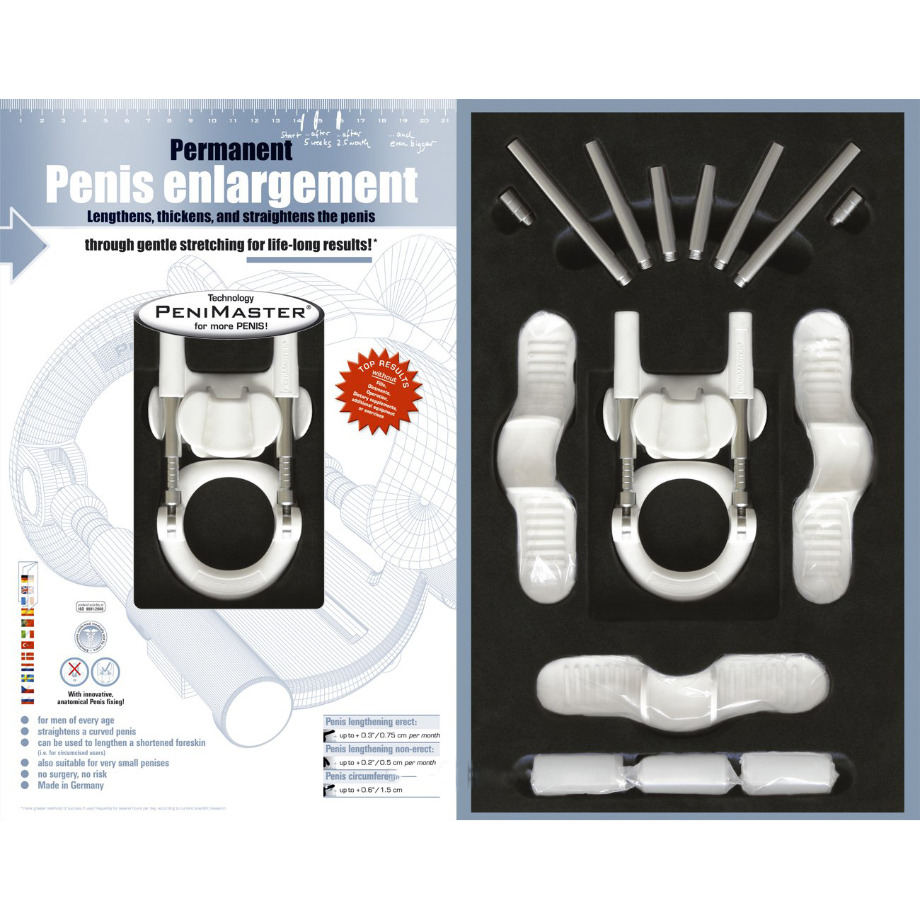 Экстендер Penimaster CHROME - специализированная система, предназначенная для увеличения длины и толщины пениса, а также для коррекции его формы без хирургического вмешательства. Курс применения устройства может колебаться от 3-4 месяцев до одного года. Экстендер Penimaster необходимо носить ежедневно на протяжении 6-8 часов. Зафиксировать устройство на пенисе довольно просто - несложная конструкция укомплектована DVD-диском с наглядным видеопособием к применению.