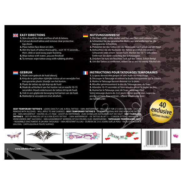 Набор тату представлен производителем AdultBodyArt. Это прекрасный выбор для темпераментной и чувственной женщины, которая умеет тонко искушать и искусно соблазнять. С помощью таких рисунков можно эффектно украсить тело для романтического свидания и страстной эротической игры.