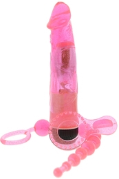 Набор Glitter Play Kit от голландского производителя Dream Toys - это все, что необходимо для жаркого и романтического викенда на двоих. В комплект входит три предмета: эрекционное кольцо, анальная цепочка и вибромассажер. Побалуйте маленькими неожиданностями своего партнера.Все игрушки созданы из качественного материала ПВХ, который не содержит фталатов и других вредных примесей. Вибромассажер имеет реалистичную форму с ярко выраженной головкой и многоскоростную вибрацию, длина - 16,5 см, диаметр - 3,5 см, работает от двух батареек типа АА. Анальная цепочка создана из постепенно расширяющихся шариков, длина - 25 см, диаметр - 0,5-2см. Эрекционное кольцо со стимулятором для клитора достаточно эластичное, поэтому подойдет для любого размера пениса.
