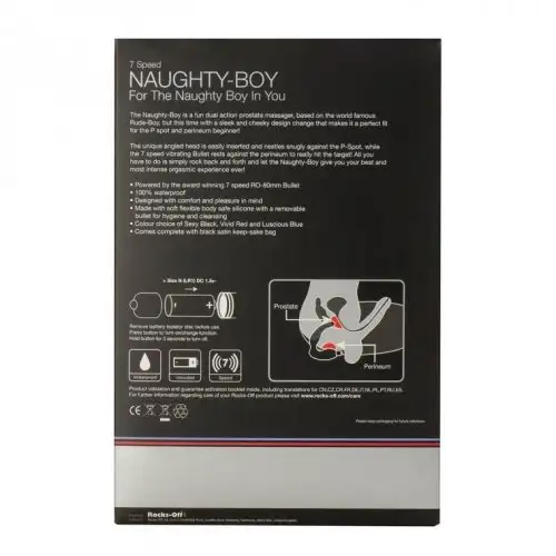 Naughty-Boy от британского бренда Rocks Off является комбинированным массажером простаты и промежности. Небольшой длины и относительно неширокий вводимый отросток подходит как для опытных, так и для начинающих пользователей подобного типа интимных приспособлений. Наружный элемент отличается более массивными габаритами и рельефной поверхностью.