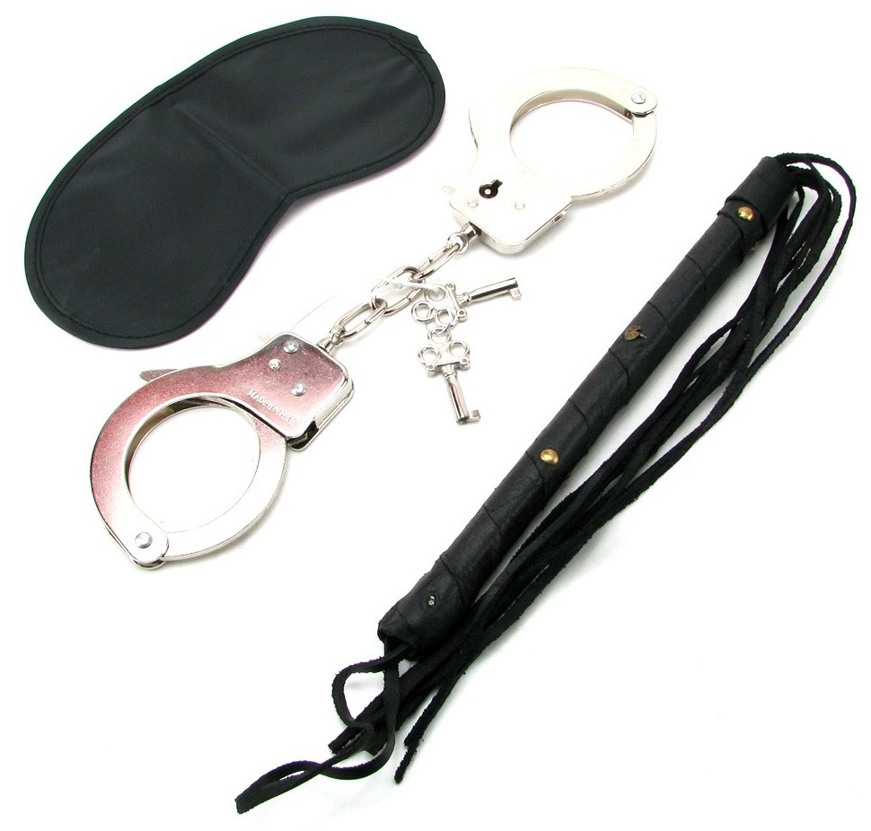 - В этом наборе есть всё, что может понадобиться для нескучной ночи - наручники (есть 2 ключа), кожаная плеть, маска на глаза.